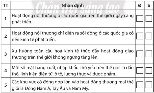 Bài tập 5 trang 128 SBT Địa lí 10: Những nhận định sau đây về tình hình phát triển và phân bố ngành thương mại là đúng (Đ) hay sai (S)? Hãy đánh dấu (X) vào các ô tương ứng bên cạnh mỗi nhận định.