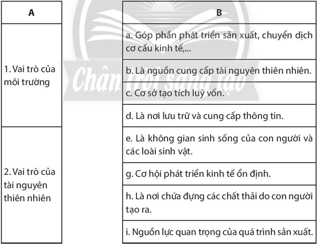 Bài tập 7 trang 138 SBT Địa lí 10: Em hãy nối các ý ở cột A cho phù hợp với các ý ở cột B nhằm thể hiện vai trò của môi trường và tài nguyên thiên nhiên.