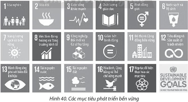 Bài tập 2 trang 140 SBT Địa lí 10: Dựa vào hình ảnh dưới đây, em hãy sắp xếp các mục tiêu phát triển bền vững vào các nhóm kinh tế, xã hội, môi trường cho phù hợp.