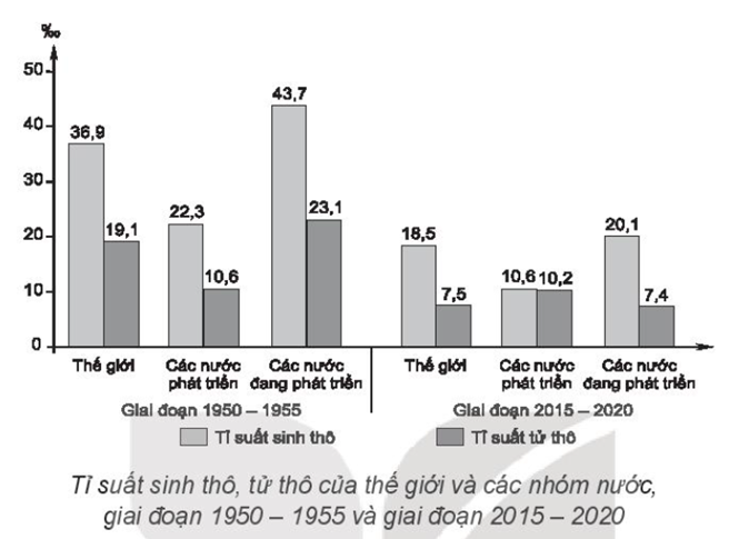 - Nhận xét: Tỉ suất sinh thô, tỉ suất tử thô giai đoạn 2015 - 2020 của thế giới, các nước phát triển và các nước đang phát triển đều giảm so với giai đoạn 1950 - 1955.