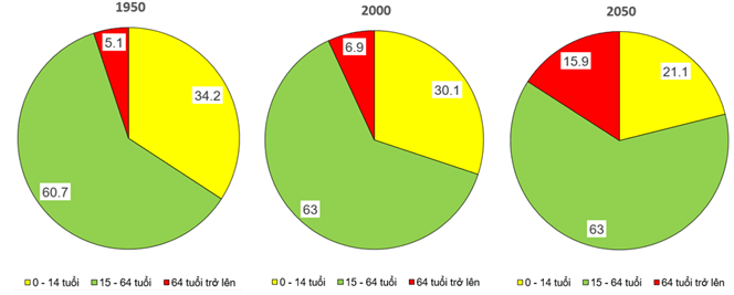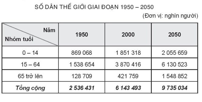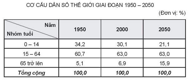 - Nhận xét về sự biến đổi cơ cấu dân số thế giới theo tuổi giai đoạn 1950 - 2050.