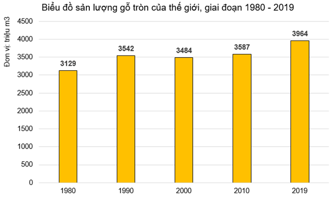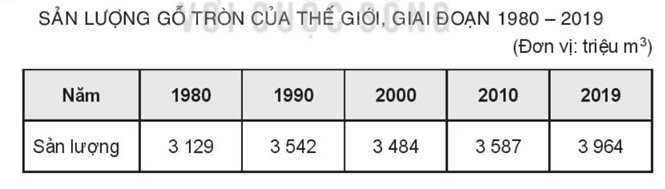 - Nhận xét: Sản lượng gỗ tròn khai thác của thế giới trong giai đoạn 1980 -2019 có xu hướng tăng.