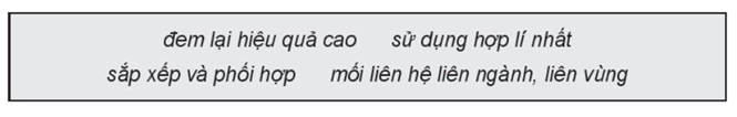 Tổ chức lãnh thổ nông nghiệp là sự (1) - sắp xếp và phối hợp các đối tượng nông nghiệp (trong (2) - mối liên hệ liên ngành, liên vùng, kết hợp với nhu cầu thị trường) trên một lãnh thổ cụ thể, nhằm (3)- sử dụng hợp lí nhất các tiềm năng về tự nhiên, kinh tế, lao động để (4) - đem lại hiệu quả cao về các mặt kinh tế, xã hội và môi trường.