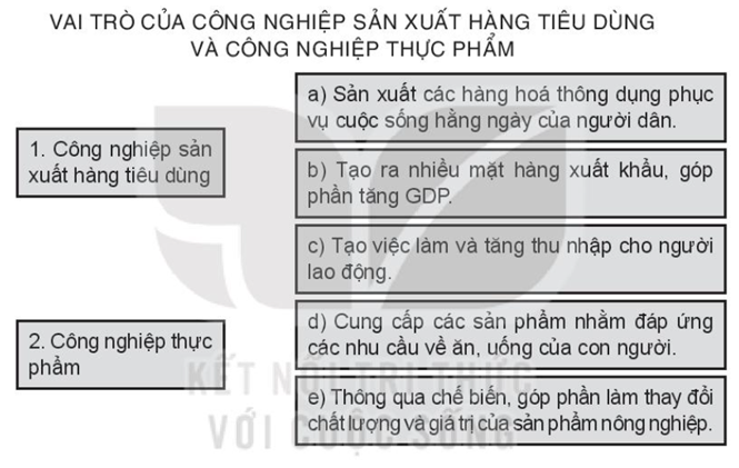 - Công nghiệp thực phẩm là lĩnh vực cung cấp các sản phẩm nhằm đáp ứng các nhu cầu về ăn, uống của con người. - Thông qua chế biến, góp phần làm thay đổi chất lượng và giá trị của sản phẩm nông nghiệp, nhờ đó thúc đẩy sản xuất nông nghiệp phát triển. - Công nghiệp thực phẩm cũng tạo ra nhiều mặt hàng xuất khẩu, tạo thêm việc làm và thu nhập cho người lao động. |