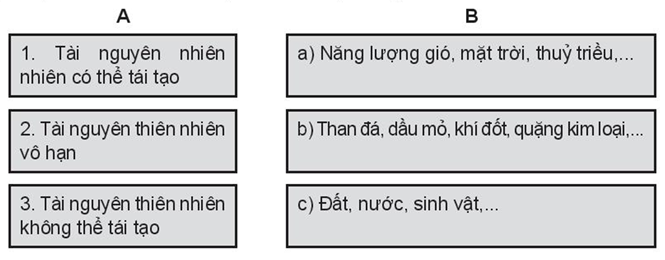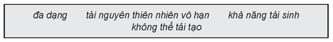 Tài nguyên thiên nhiên rất (1) - đa dạng Có nhiều cách phân loại tài nguyên thiên nhiên. Cách phân loại thông dụng nhất hiện nay là dựa vào (2) - khả năng tái sinh của tài nguyên so với tốc độ tiêu thụ của con người. Theo đó, tài nguyên thiên nhiên được chia thành hai loại là (3) - tài nguyên thiên nhiên vô hạn và tài nguyên thiên nhiên hữu hạn. Tài nguyên thiên nhiên hữu hạn lại được chia thành tài nguyên có thể tái tạo và tài nguyên (4) - không thể tái tạo