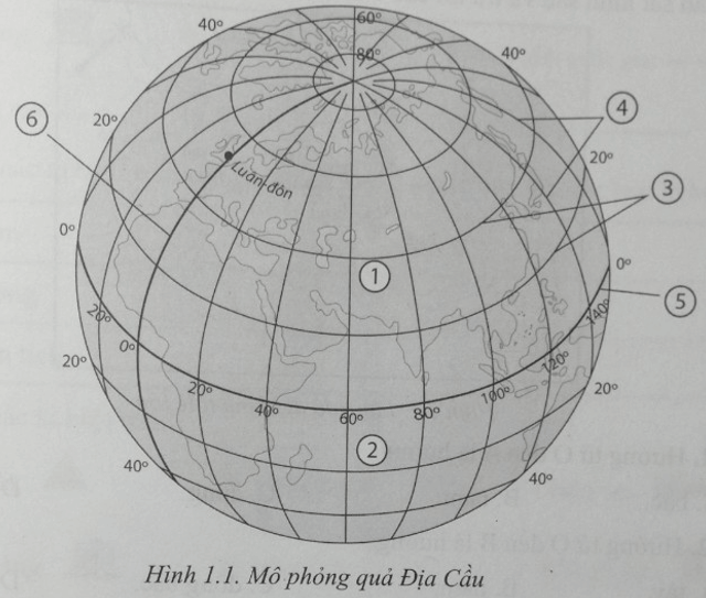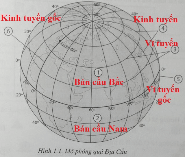 (1) bán cầu Bắc; (2) bán cầu Nam; (3) vĩ tuyến; (4) kinh tuyến; (5) vĩ tuyến gốc; (6) kinh tuyến gốc.