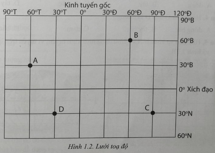 Câu 8 trang 49 sách bài tập Địa Lí lớp 6: Hãy viết tọa độ địa lí của các điểm A, B, C, D trong hình 1.2.