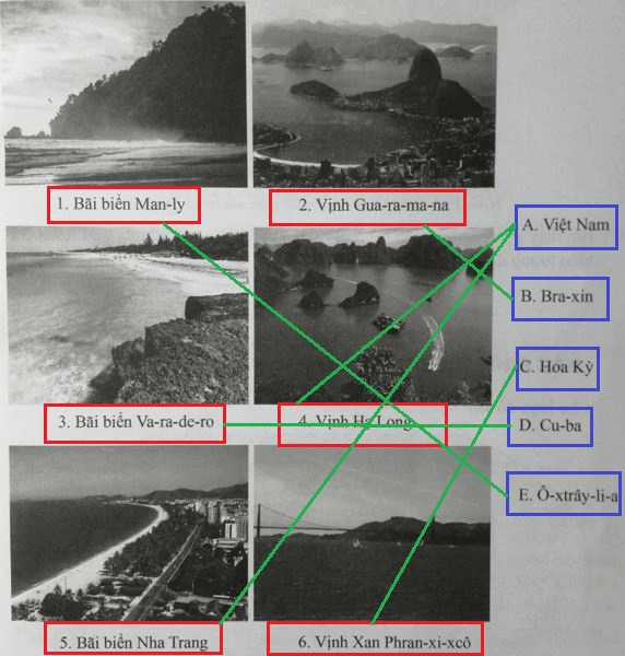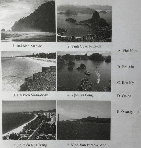 Câu 5 trang 75 sách bài tập Địa Lí lớp 6: Ghép tên các ảnh bãi biển hay vịnh biển với tên nước sao cho đúng.