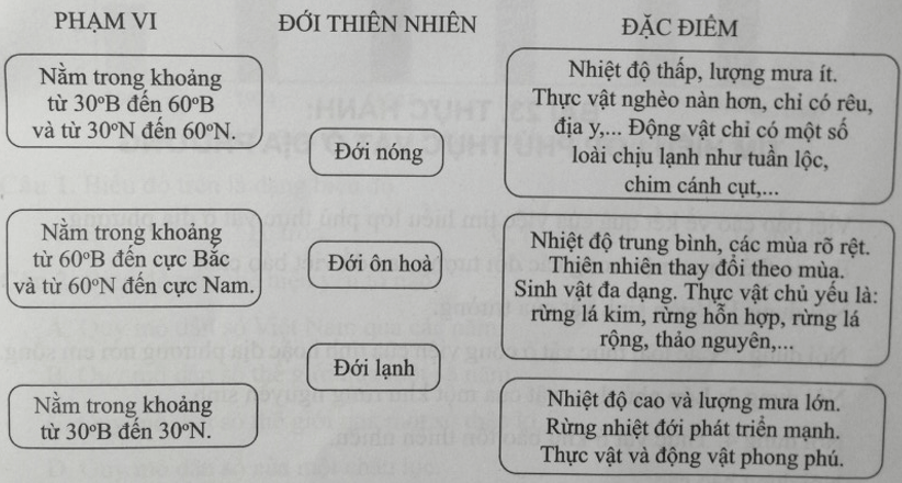 Câu 5 trang 79 sách bài tập Địa Lí lớp 6: Hãy nối ô ở giữa với ô bên trái và ô bên phải sao cho hợp lí khi nói về phạm vi và đặc điểm của các đới thiên nhiên trên Trái Đất.