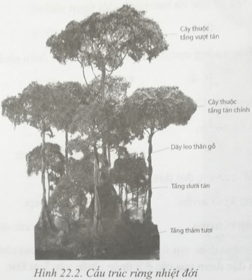 - Rừng nhiệt đới có cấu trúc phức tạp, từ dưới lên trên có các tầng: tầng thảm tươi, tầng dưới tán, dây leo thân gỗ, tầng tán chính, tầng vượt tán.