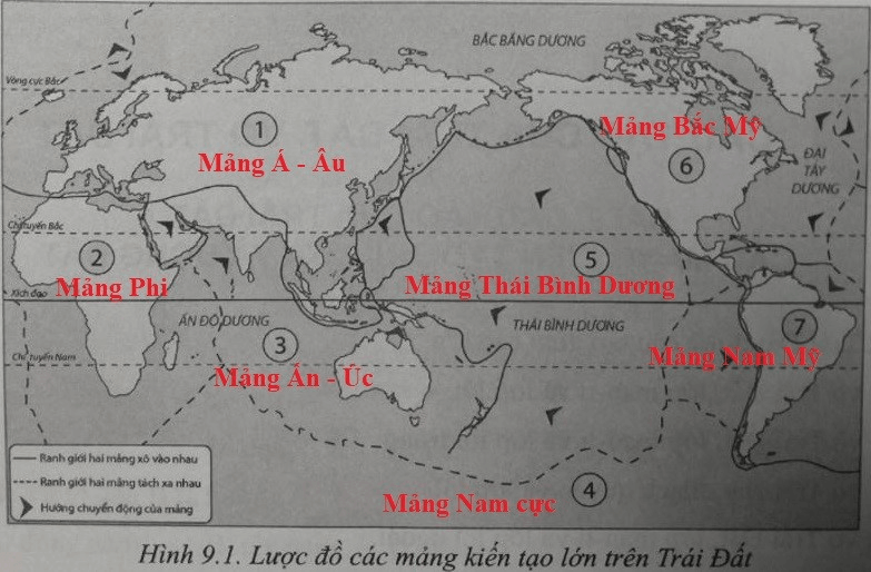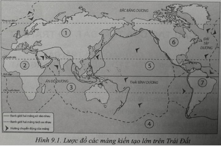 Câu 6 trang 62 sách bài tập Địa Lí lớp 6: Hãy đọc tên bảy mảng kiến tạo lớn được đánh số (1), (2), (3), (4), (5), (6), (7) trong hình sau: