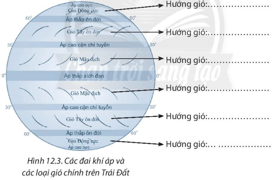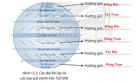 2. Dựa vào hình 12.3, em hãy cho biết hướng của các loại gió chính trên Trái Đất ở hai bán cầu:
