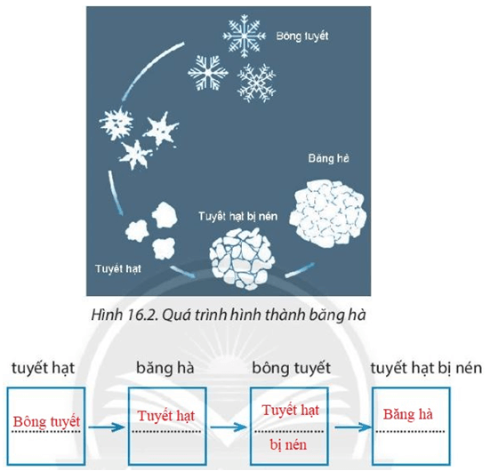 Câu 4 trang 53 sách bài tập Địa Lí 6: Quan sát hình dưới đây, hãy chọn và điền các từ đã cho vào ô trống để hoàn thành sơ đồ thể hiện quá trình hình thành băng hà.