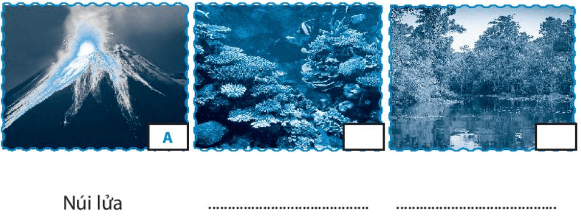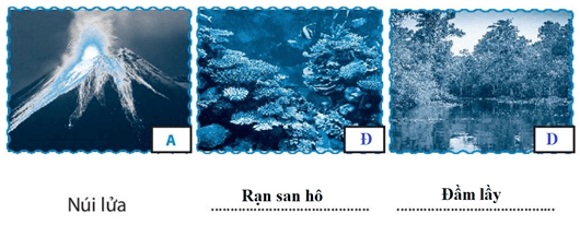 Câu 2 trang 8 sách bài tập Địa Lí 6: Hãy đặt tên cho các hình ảnh sau bằng cách lựa chọn những cụm từ thích hợp trong hộp bên dưới, sau đó lựa chọn các kí hiệu A, B, C, D, Đ, E tương ứng và ghi vào khoảng trống ở mỗi hình.