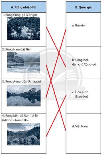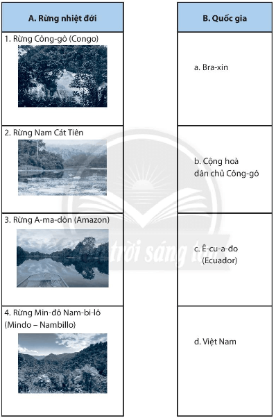 Câu 4 trang 67 sách bài tập Địa Lí 6: Dựa vào thông tin trong SGK, ghép cặp rừng nhiệt đới ở cột A với các quốc gia ở cột B sao cho phù hợp: