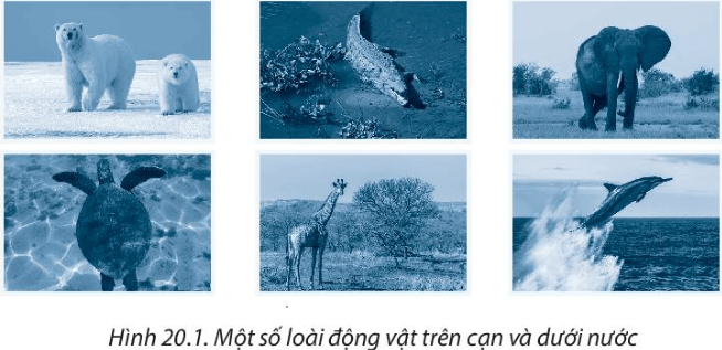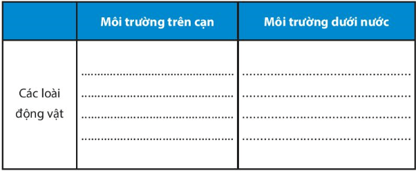 Câu 2 trang 65 sách bài tập Địa Lí 6: Dựa vào các hình ảnh sau, em hãy phân chia và điền một số loài động vật theo môi trường trên cạn và dưới nước vào bảng.