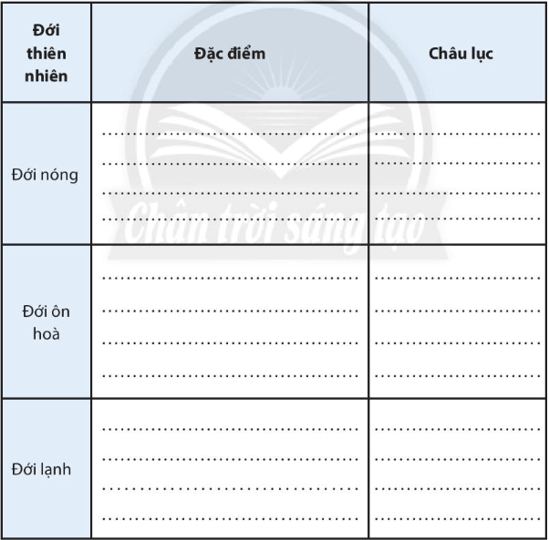 Câu 3 trang 66 sách bài tập Địa Lí 6: Dựa vào hình 20.3 và thông tin trong SGK, em hãy nêu một số đặc điểm của các đới thiên nhiên trên thế giới và kể tên các châu lục thuộc đới thiên nhiên đó.
