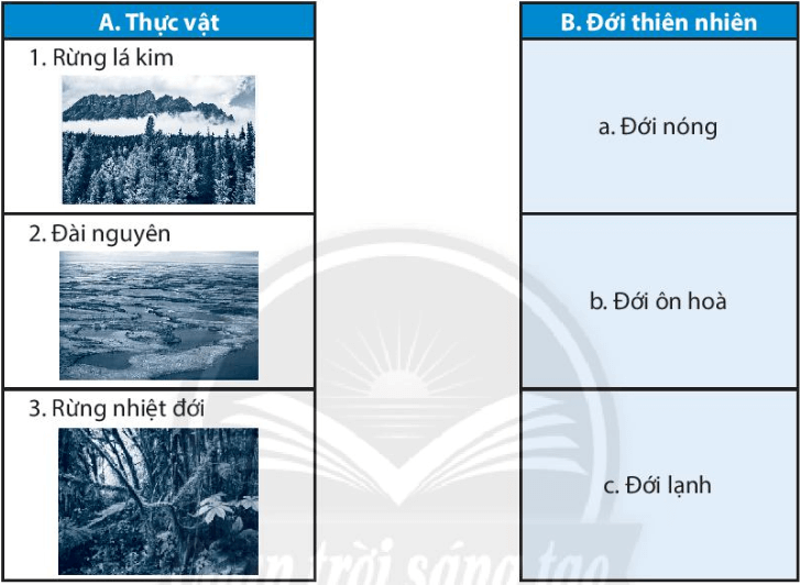 Câu 1 trang 65 sách bài tập Địa Lí 6: Ghép cặp các loài thực vật ở cột A với đới thiên nhiên ở cột B sao cho phù hợp:
