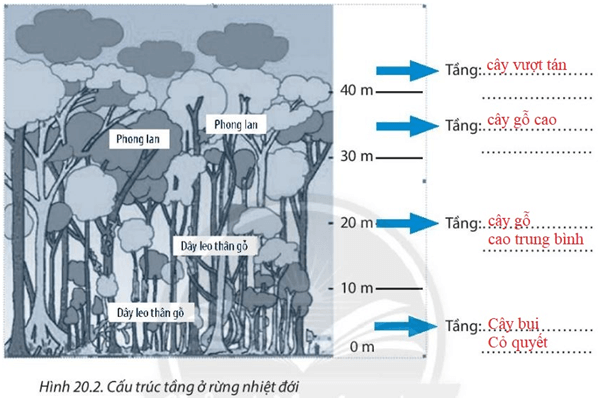 Câu 5 trang 68 sách bài tập Địa Lí 6: Dựa vào hình 20.4 trong SGK và hình 20.2, em hãy điền tên các tầng của rừng nhiệt đới và loài thực vật đặc trưng ở mỗi tầng.