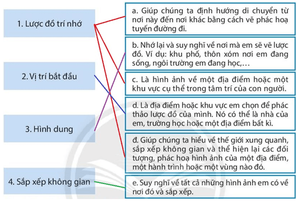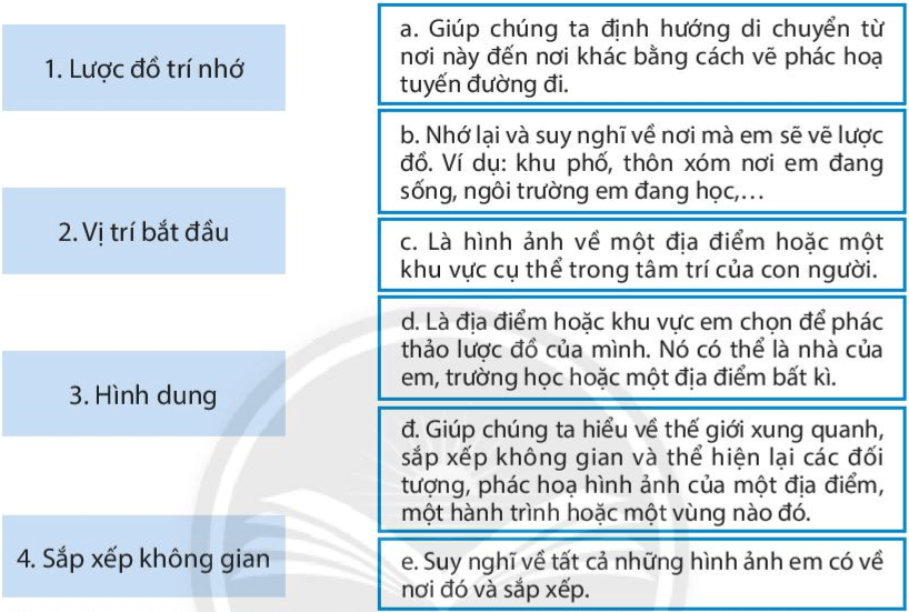 Câu 1 trang 15 sách bài tập Địa Lí 6: Hãy nối các ý 1, 2, 3, 4 ở các ô bên trái với mô tả tương ứng a, b, c, d, đ, e ở các ô bên phải (các ý bên trái có thể lặp lại hơn một lần).