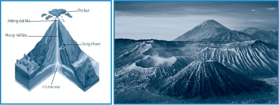 - Các bộ phận của núi lửa: lò măcma, dung nham, họng núi lửa, miệng núi lửa và tro bụi.
