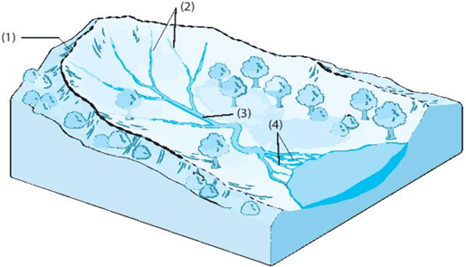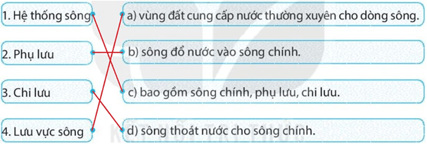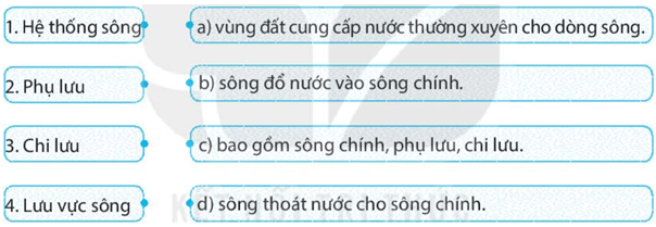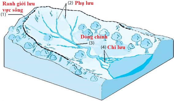 Câu 3 trang 46 sách bài tập Địa Lí lớp 6: Hãy chú thích các bộ phận: “dòng chính, chi lưu, phụ lưu, ranh giới lưu vực sông”
