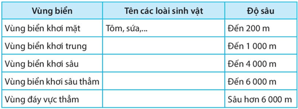 Câu 2 trang 56 sách bài tập Địa Lí lớp 6: Ghi tên các loài sinh vật vào bảng theo mẫu dưới đây cho phù hợp.