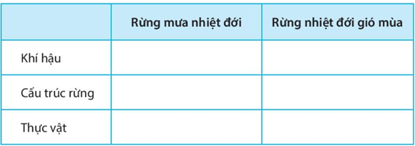 Câu 2 trang 57 sách bài tập Địa Lí lớp 6: Hãy hoàn thành bảng theo mẫu sau để so sánh đặc điểm của rừng mưa nhiệt đới và rừng nhiệt đới gió mùa.