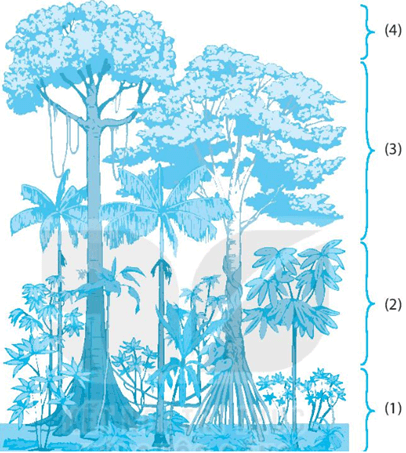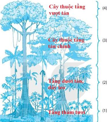 (1) Tầng thảm tươi; (2) Tầng dưới tán, dây leo; (3) Cây thuộc tầng tán chính; (4) Cây thuộc tầng vượt tán.
