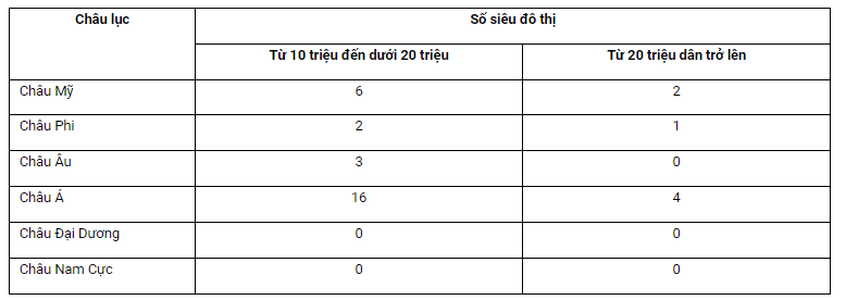 - Đô thị trên 20 triệu dân có ở châu Á (4 đô thị), châu Mỹ (2 đô thị) và châu Phi (1 đô thị).