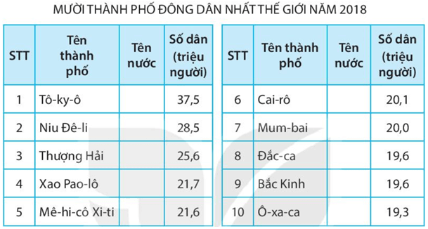 b) Tên của năm thành phố đông dân trên thế giới năm 2018