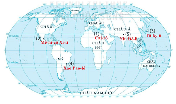 b) Xác định tên của năm thành phố đông dân trên thế giới năm 2018 trong lược đồ sau: