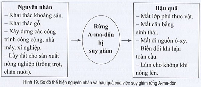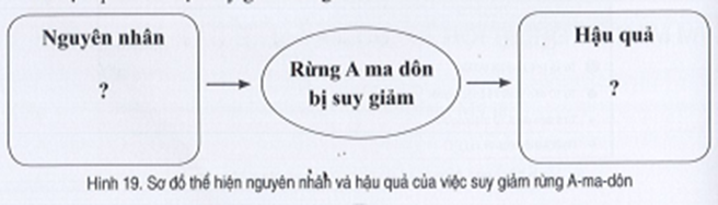 Hãy xếp các cụm từ trên vào sơ đồ theo mẫu sau để thể hiện được nguyên nhân và hậu quả của việc suy giảm rừng A-ma-dôn