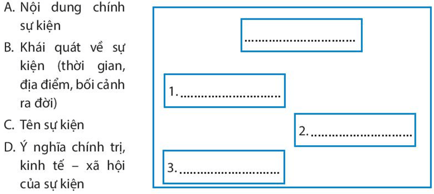 Bài tập 3 trang 50 SBT Địa lí 7: Dựa vào thông tin bên dưới, hãy điền các chữ A, B, C, D vào chỗ trống (...) theo thứ tự nội dung trình bày của bài báo cáo một sự kiện lịch sử.