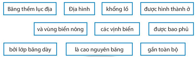 Bài tập 1 trang 80 SBT Địa lí 7: Từ các ô bên dưới, đặt ba câu có ý nghĩa về địa hình châu Nam Cực.