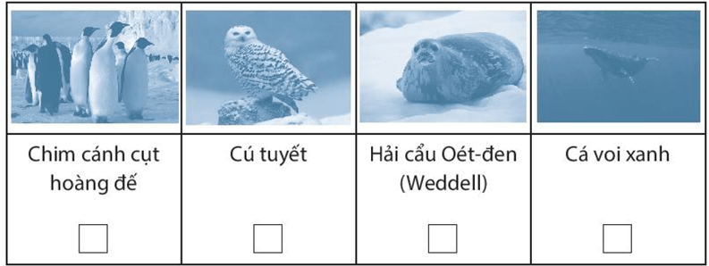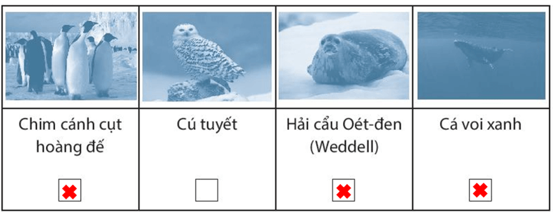 Bài tập 4 trang 81 SBT Địa lí 7: Quan sát các hình sau, hãy đánh dấu (X) vào ô trống để cho biết loài động vật tiêu biểu sống ở châu Nam Cực.