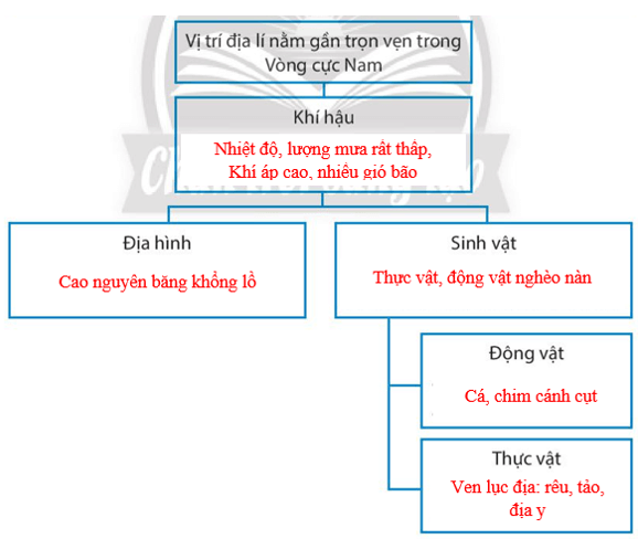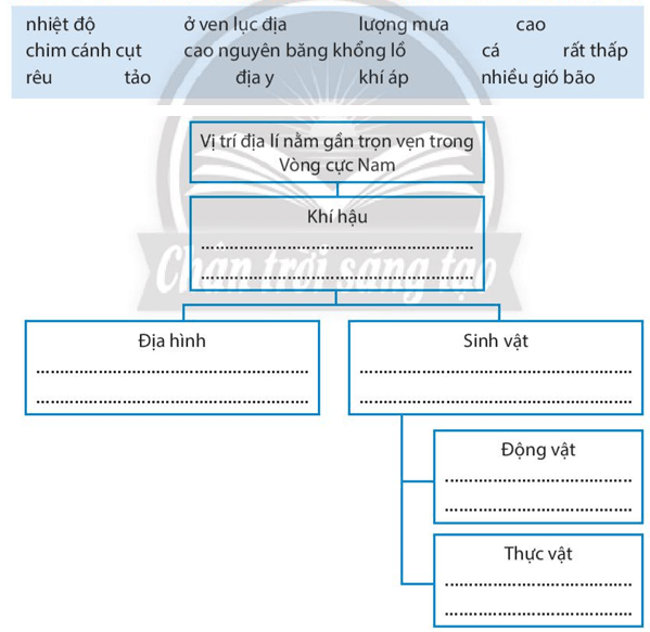 Bài tập 5 trang 81 SBT Địa lí 7: Hãy sử dụng các từ đã cho trong hộp thông tin bên dưới để hoàn thành sơ đồ về mối quan hệ giữa các đặc điểm tự nhiên ở châu Nam Cực.