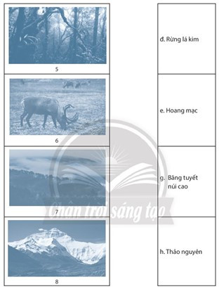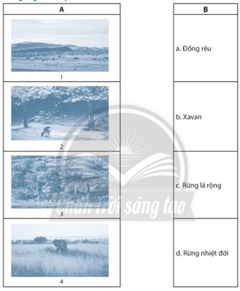 Bài tập 7 trang 28, 29 SBT Địa lí 7: Hãy chọn các hình ảnh ở cột A cho phù hợp với các thông tin ở cột B và ghi vào chỗ trống (...) bên dưới bảng. Sau đó ghi tên đới thiên nhiên tương ứng với kết quả đó.