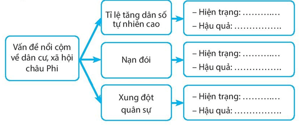 Bài tập 2 trang 36 SBT Địa lí 7: Hoàn thành sơ đồ theo mẫu sau, để thấy rõ những vấn đề nổi cộm về dân cư, xã hội ở châu Phi.