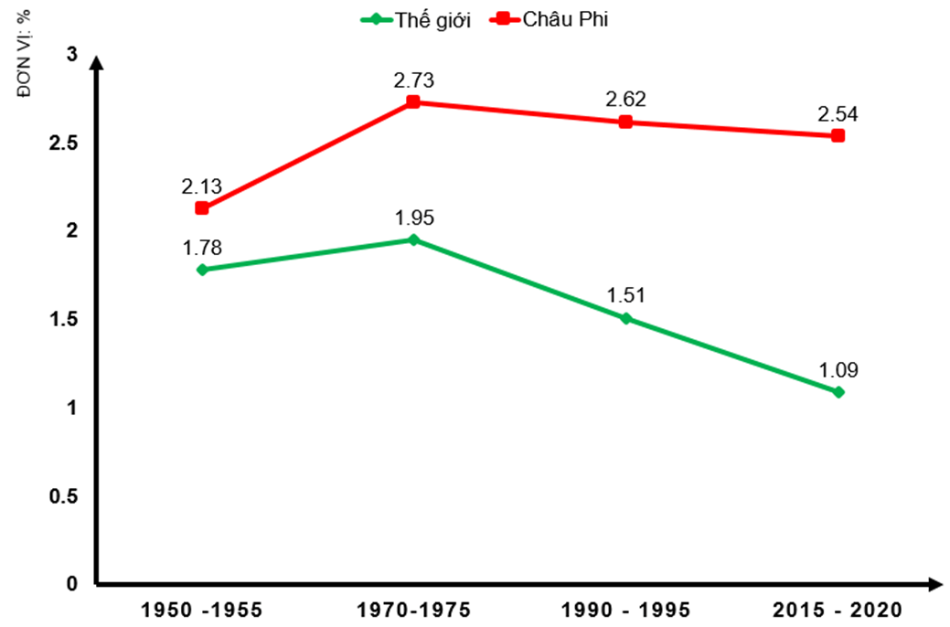 Biểu đồ thể hiện tỉ lệ tăng dân số tự nhiên của thế giới và châu Phi giai đoạn 1950 - 2020