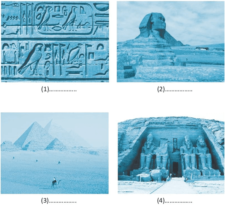 Bài tập 7 trang 37 SBT Địa lí 7: Ghép tên các di sản lịch sử của châu Phi với các hình ảnh cho phù hợp kim tự tháp, đền A-bu Xim-ben, tượng Nhân sự, chữ tượng hình.