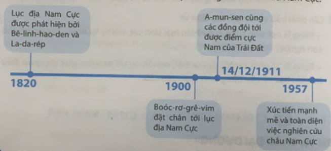 Bài tập 2 trang 58 SBT Địa lí 7: Hãy hoàn thành sơ đồ các mốc chính trong lịch sử khám phá và nghiên cứu châu Nam Cực theo gợi ý sau.