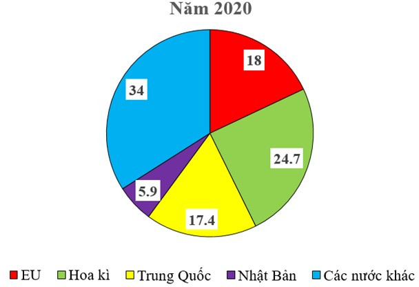Biểu đồ thể hiện cơ cấu GDP của các trung tâm kinh tế lớn trên thế giới năm 2020