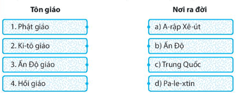 Châu Á là nơi ra đời của bốn tôn giáo lớn trên thế giới. (1).............. ra đời vào khoảng hơn một nghìn năm trước Công nguyên và (2).............. ra đời vào (3)……....... trước Công nguyên tại Ấn Độ. (4).............. được hình thành từ đầu Công nguyên tại (5)…….......... Hồi giáo ra đời vào (6)............. tại A-rập Xê-út.