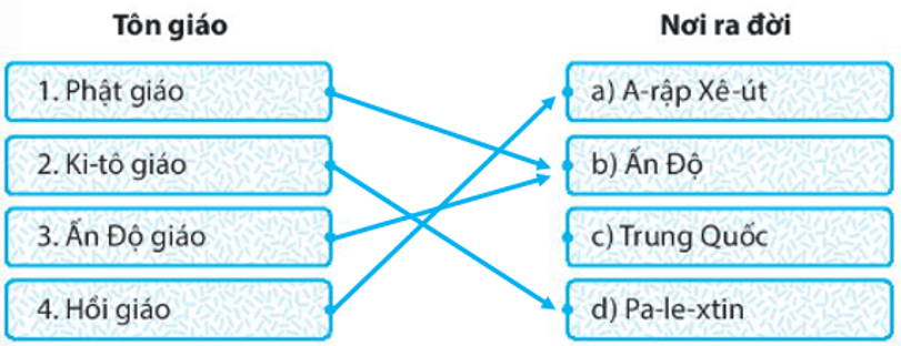 Châu Á là nơi ra đời của bốn tôn giáo lớn trên thế giới. (1) Ấn Độ giáo ra đời vào khoảng hơn một nghìn năm trước Công nguyên và (2) Phật giáo ra đời vào (3) thế kỉ VI trước Công nguyên tại Ấn Độ. (4) Ki-tô giáo được hình thành từ đầu Công nguyên tại (5) Pa-le-xtin. Hồi giáo ra đời vào (6) thế kỉ VII tại A-rập Xê-út.