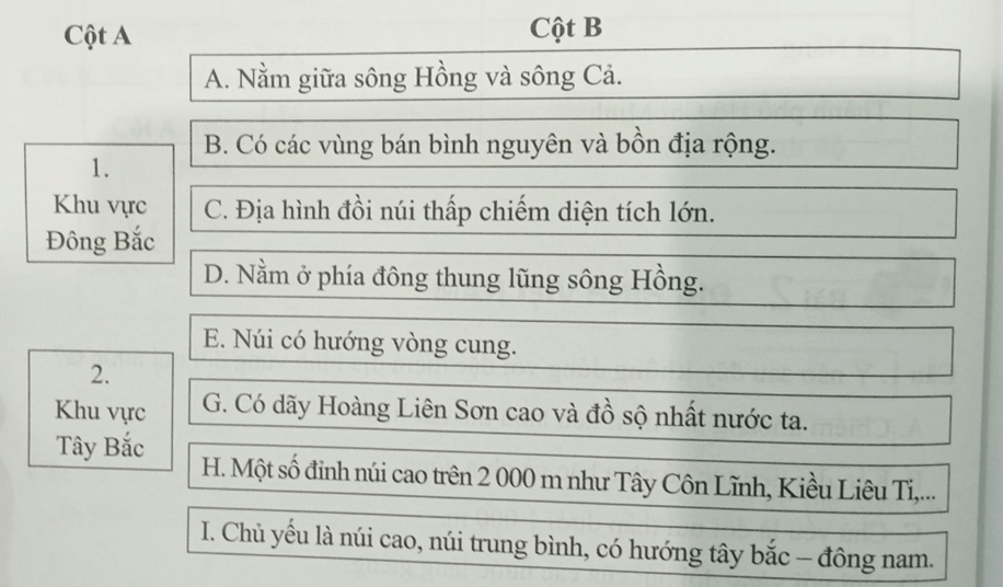 Câu 5 trang 52 SBT Địa Lí 8: Ghép ý ở cột A với các ý ở cột B sao cho đúng với đặc điểm địa hình của khu vực Đông Bắc và khu vực Tây Bắc.