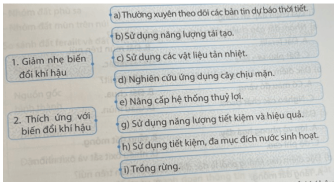 Câu 6 trang 31 SBT Địa Lí 8: Ghép các ô bên trái với các ô bên phải cho phù hợp về một số giải pháp ứng phó với biến đổi khí hậu