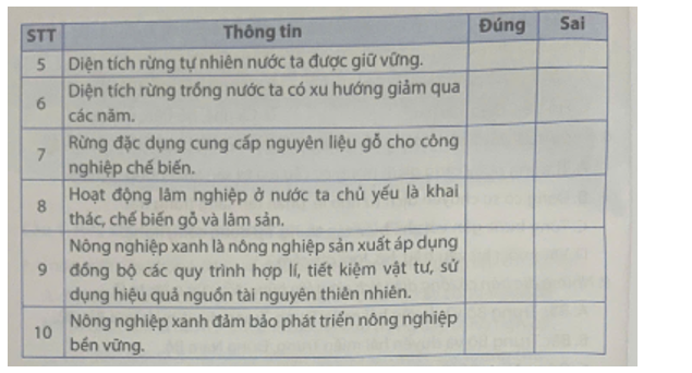Bài tập 2. Xác định thông tin đúng hoặc sai về ngành nông nghiệp, lâm nghiệp, thuỷ sản ở nước ta bằng cách đánh dấu (x) vào ô tương ứng.