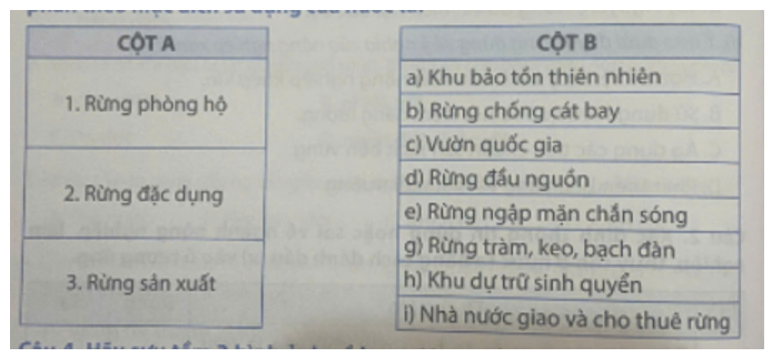 Bài tập 3. Hãy nối các ý ở cột A với các ý ở cột B cho phù hợp về các loại rừng phân theo mục đích sử dụng của nước ta.