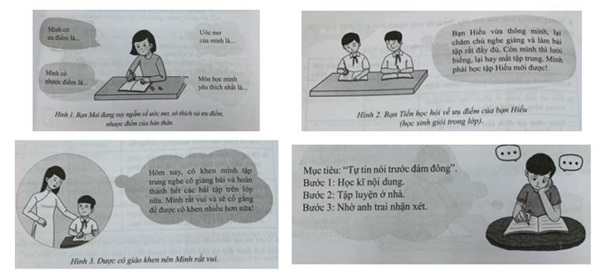 - Hình 1: Bạn Mai tự nhận thức bản thân bằng cách suy ngẫm về ước mơ, sở thích, ưu điểm và nhược điểm của bản thân